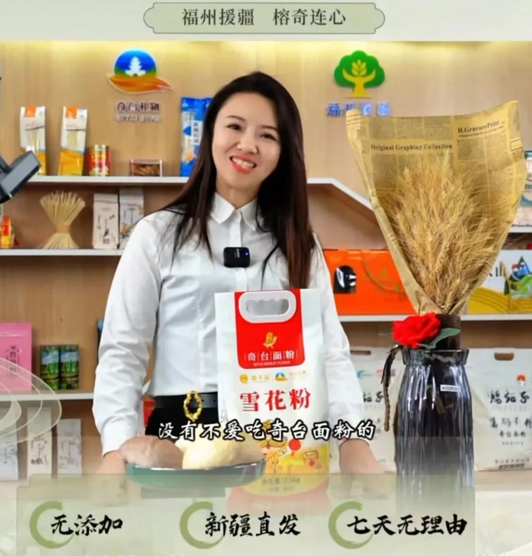 奇台县宣传大使高燕正在直播间推介奇台面粉。   奇台县电商中心供图