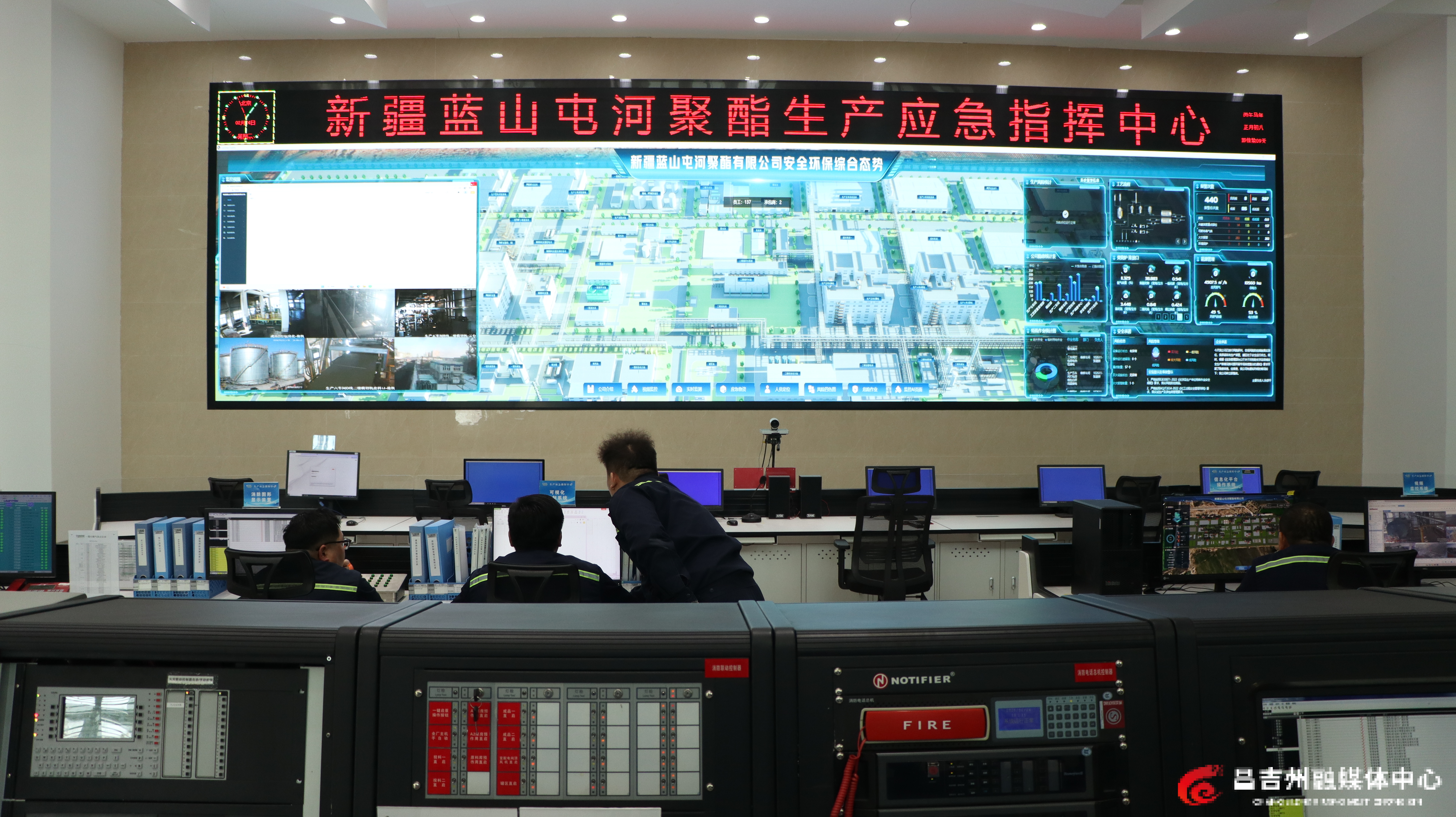 2月24日,新疆蓝山屯河聚酯有限公司生产应急指挥中心工作人员在岗监控生产线运行情况。记者杨鹤 摄