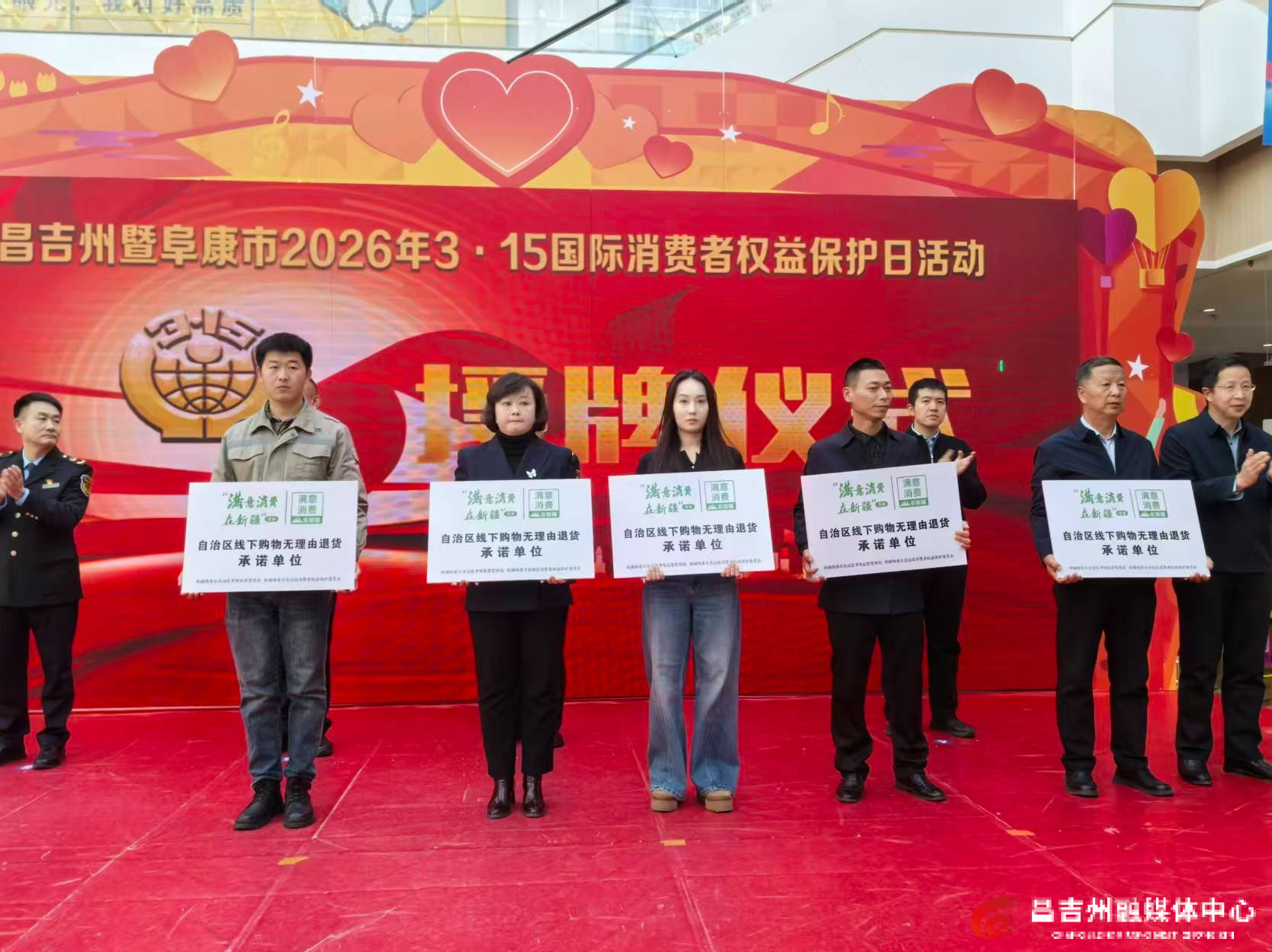 3月13日,在昌吉州暨阜康市“3·15”国际消费者权益日纪念大会上,为5家线下无理由退货承诺单位授牌。实习记者马军 摄