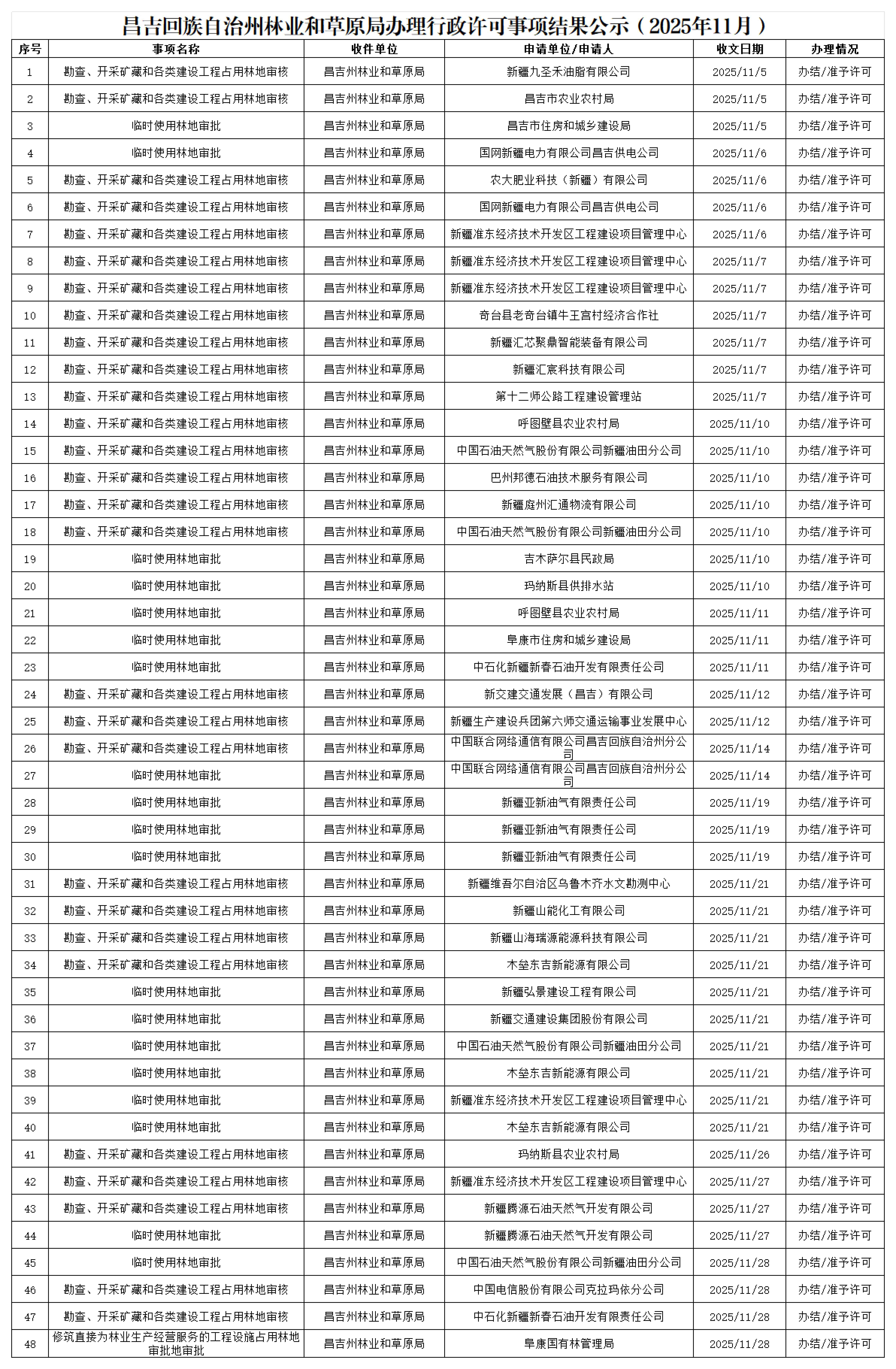 【行政许可】昌吉回族自治州林业和草原局办理行政许可事项结果公示(2025年11月)
