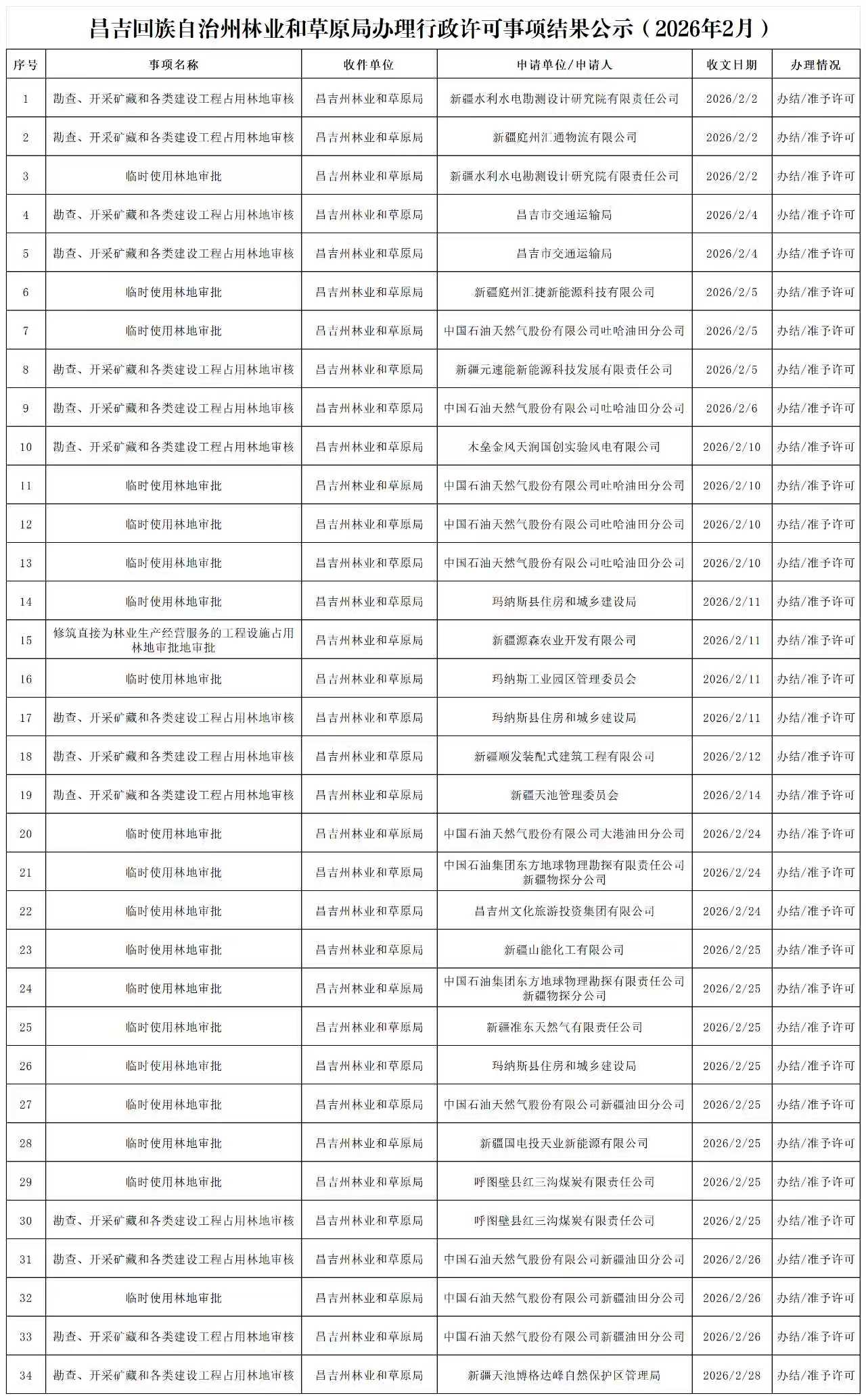 【行政许可】昌吉回族自治州林业和草原局办理行政许可事项结果公示(2026年2月)