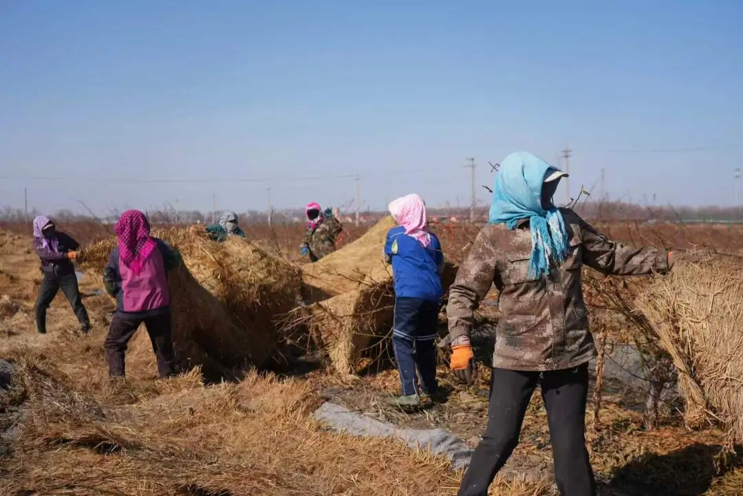 3月27日,在阜康市城关镇良繁中心村繁盛家庭农场的桃园里,农户们为越冬桃树揭去草帘子。张鹏 摄