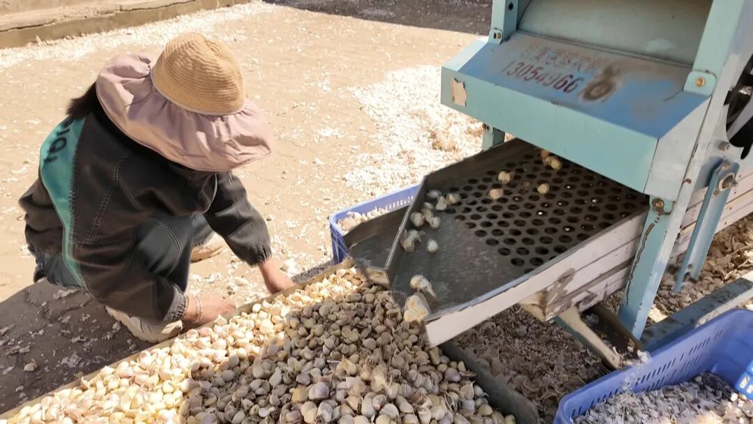 在新地乡大蒜连片种植地,一台台大蒜打孔机匀速前行,高效完成开沟、铺滴灌带、撒肥等一系列作业,大幅提升了播种效率。田间地头,还有不少周边村民前来务工,他们忙着分剥蒜种、核查播种质量,协助做好田间辅助工作,呈现出一派热火朝天的农忙景象。