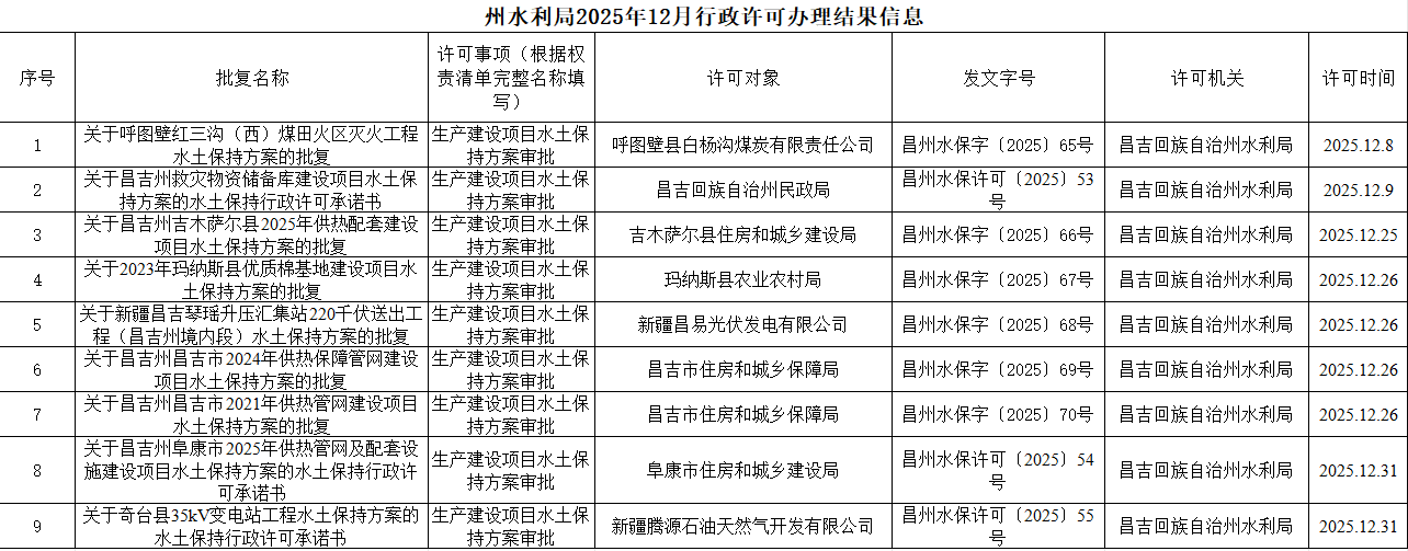 【行政许可】州水利局2025年12月行政许可办理结果信息