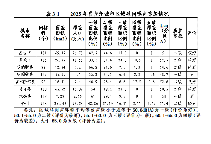 2025年,全州7个县市进行了区域昼间环境噪声监测,共设置了708个测点,累计监测面积230.46公里,覆盖人口73.38万人,平均等效声级范围在48.7-54.6分贝(A)之间,平均值为51.4分贝(A),比上年的50.9分贝(A),同比上升0.5分贝(A)。全州各县市中,有2个县市(呼图壁县、木垒县)城市区域声环境质量为好,占28.6%;有5个城市(玛纳斯县、昌吉市、阜康市、奇台和吉木萨尔县)为较好,占71.4%。
