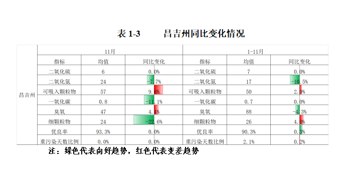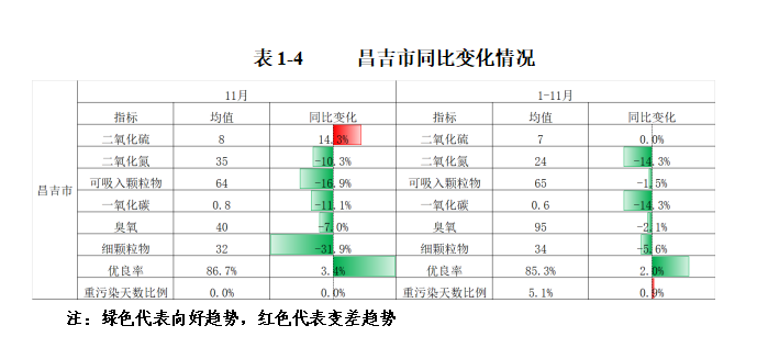 昌吉市1-11月优良天数比例为85.3%,同比上升2.0%,重污染天数比例为5.1%,同比上升0.9%;PM10平均浓度为65µg/m3,同比下降1.5%;PM2.5平均浓度为34µg/m3,同比下降5.6%;SO2平均浓度为7µg/m3,同比持平;NO2平均浓度为24µg/m3,同比下降14.3%;CO平均浓度为0.6mg/m3,同比下降14.3%;臭氧(日最大8小时滑动平均)为95µg/m3,同比下降2.1%。见表1-4。