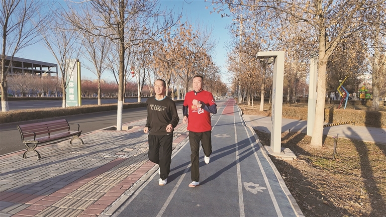 市民魏先生(右)与跑友相约在昌吉体育馆外的跑道慢跑。 白 珂摄