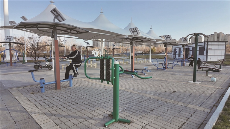 市民在昌吉体育馆前新增的健身器材上锻炼。 白 珂摄