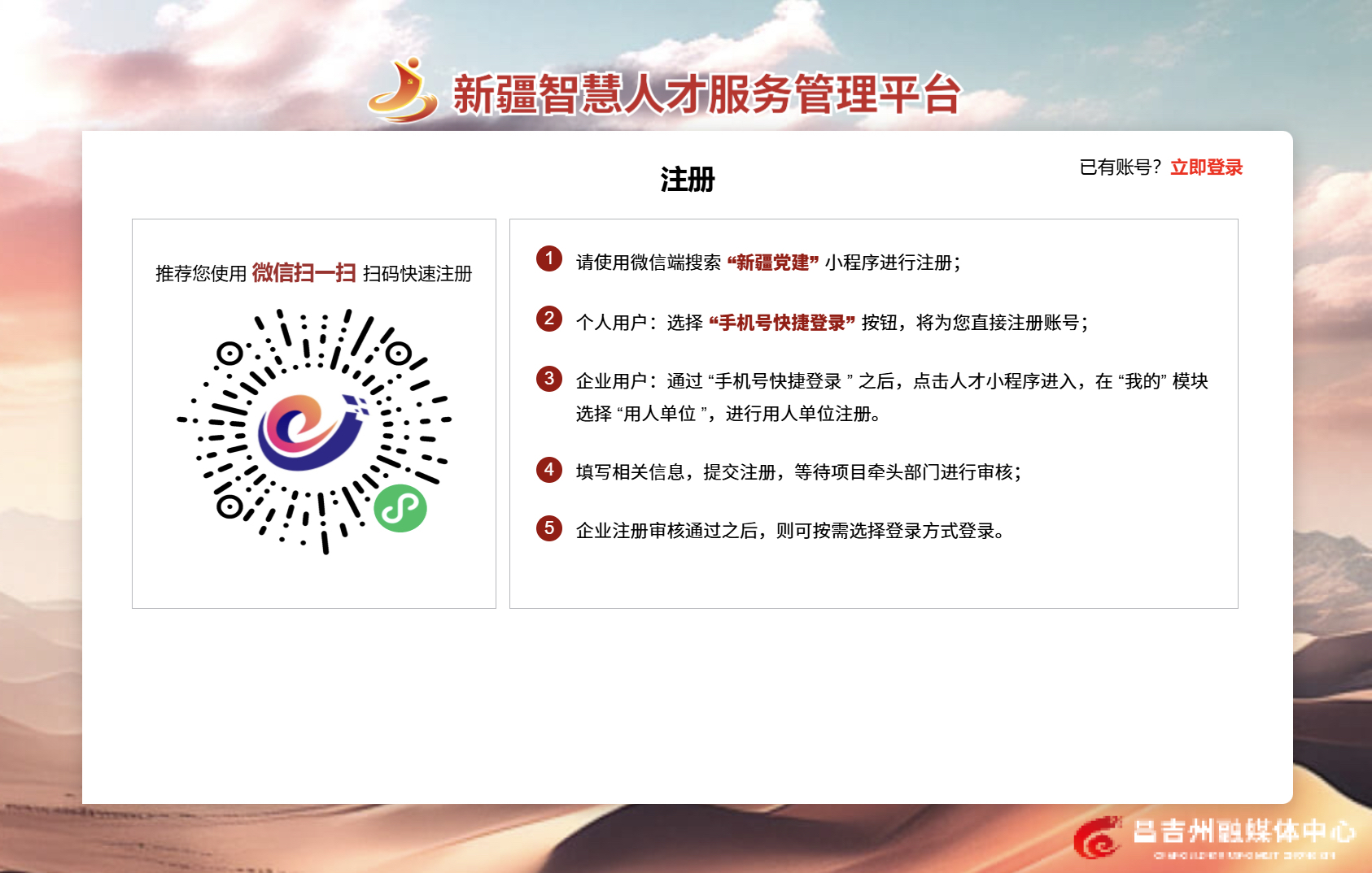 即日起,昌吉州各领域优秀人才可登录“新疆智慧人才管理服务平台”(https://rcweb.xjkunlun.cn/xmtcweb/#/login),密切关注申报指南等信息发布情况,获取更多相关资讯,积极参与项目申报。
