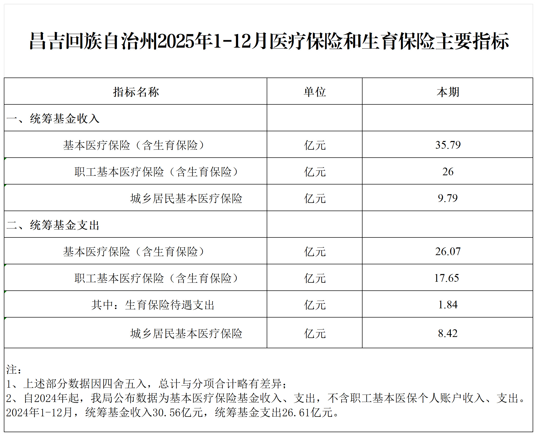 昌吉回族自治州2025年1-12月医疗保险和生育保险主要指标