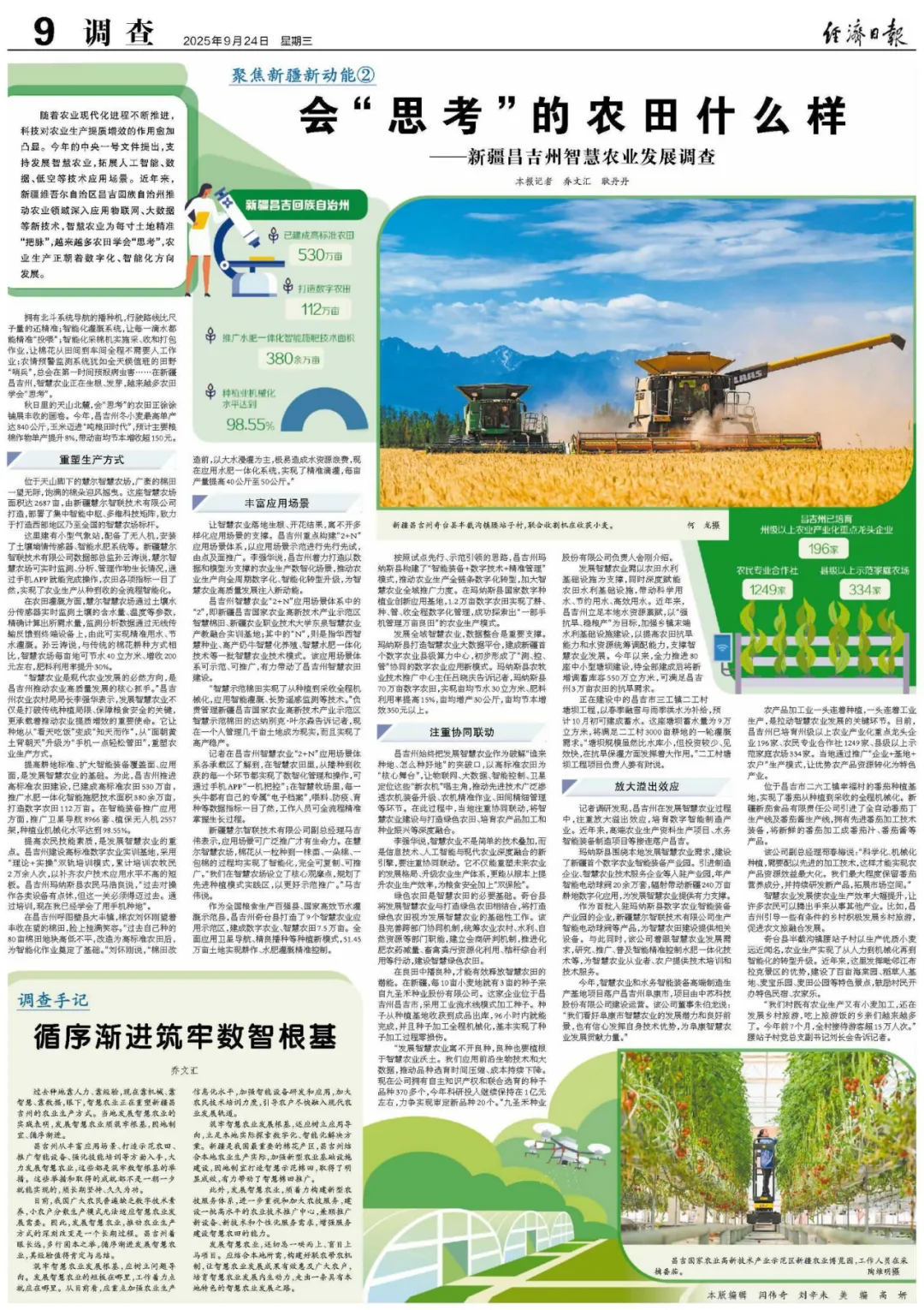 昌吉州始终把发展智慧农业作为破解“谁来种地、怎么种好地”的突破口,以高标准农田为“核心舞台”,让物联网、大数据、智能控制、卫星定位这些“新农机”唱主角,推动先进技术广泛渗透农机装备升级、农机精准作业、田间精细管理等环节。在此过程中,当地注重协同联动,将智慧农业建设与打造绿色农田、培育农产品加工和种业振兴等深度融合。