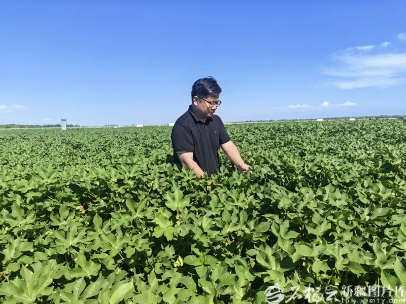中国农业科学院西部农业研究中心棉花布局与低碳生产技术创新团队首席科学家王占彪在棉田进行田间调查。图/受访者提供