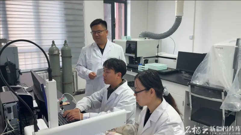 王占彪(左一)团队人员在进行室内试验。图/受访者提供