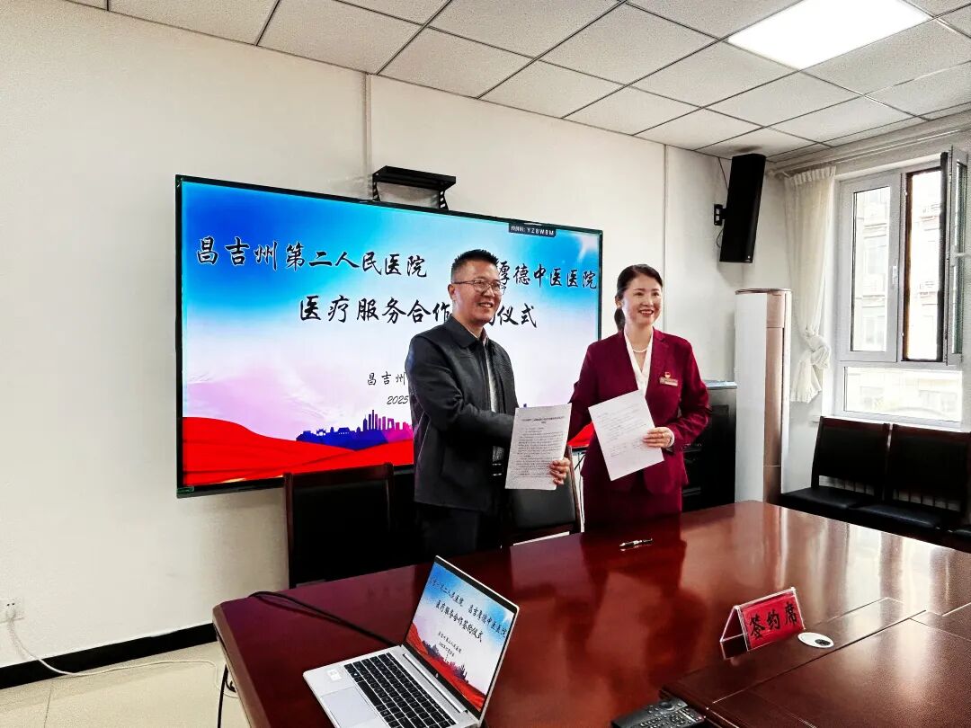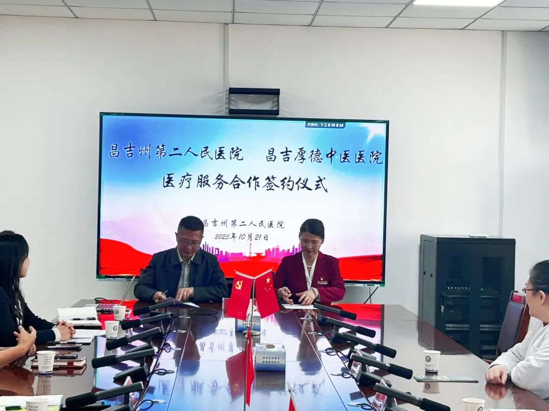 签约仪式在昌吉州第二人民医院举行。昌吉州第二人民医院院长刘新、业务副院长林勇,昌吉厚德中医医院院长张光梅、副院长董梅德及双方相关部门负责人共同出席。