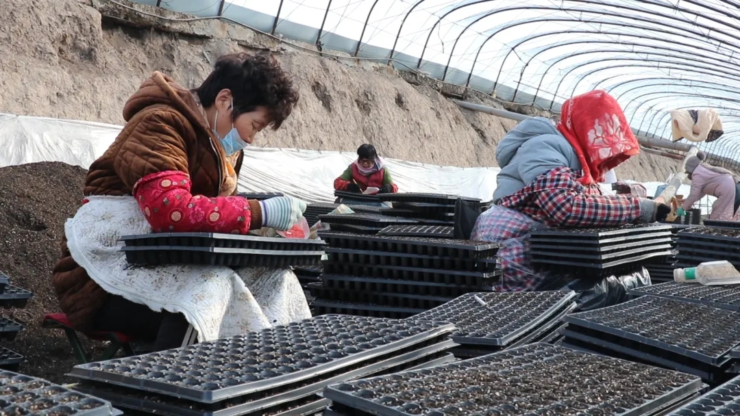 大棚里,除了机械高效作业,数十名本地村民也忙着人工点种、搬运苗盘,大家各司其职、干劲十足,在家门口实现了稳定就业。工人赵小粉说:“在家门口干活挺方便的,补贴家用,一天能挣个八九十块钱。”