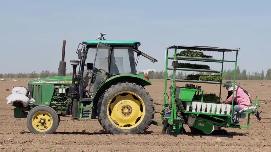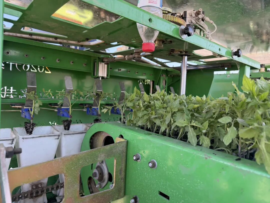 雷新忠种植番茄已经5年了,过去使用滚筒式移栽机需人工放苗,覆土效果不佳,影响秧苗扎根。今年他引进最新一代全自动秧苗移栽机,移栽效率大幅提高,劳动强度降低。他说:“这台是2026年的新款移栽机,栽苗不用人工放苗,机器自动完成,上土也不用人工,机械自己就能上土。”