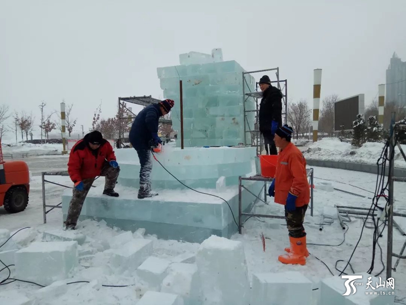 天山网讯(记者孙圆圆 通讯员武静宇摄影报道)昌吉市第十七届冰灯艺术节将于1月20日开幕。摆放、粘合、切冰、打磨……1月13日,在昌吉市滨湖河中央公园,几名冰雕师傅冒着严寒,精心打磨着几组雪雕、冰雕造型,为即将举办的第十七届冰灯艺术节忙碌着。