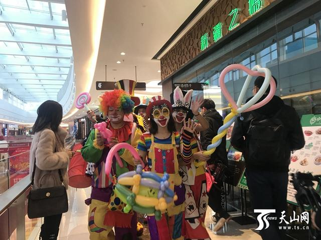 小丑在购物中心巡回,给顾客派发气球。