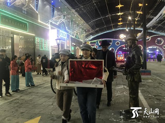 由汇嘉时代昌吉购物中心打造的星光夜市,仿夜上海场景,繁星点点的灯光下,跑着电轨车,拉着游客体验的黄包车,还有梳着小辫穿着格子衫的买花姑娘穿梭于人群,向来往顾客推销鲜花……