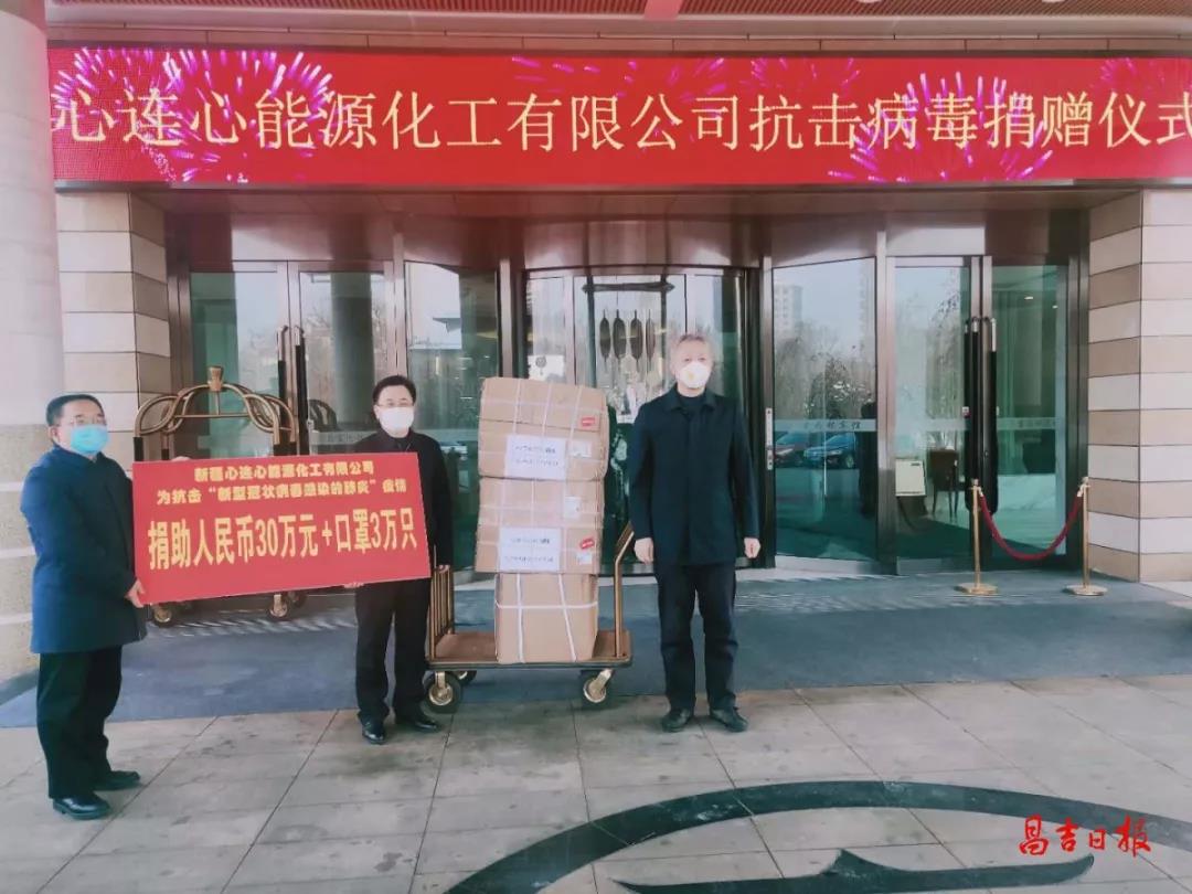 昌吉日报全媒体记者 廖冬云 报道:在抗击疫情的关键时期,全疆各地医疗物资比较紧缺的情况下,2月5日下午,新疆心连心能源化工有限公司(以下简称心连心公司)紧急从内地采购3万只防护口罩捐献给昌吉州疫情防控指挥部,同时捐款30万元用于抗击疫情。
