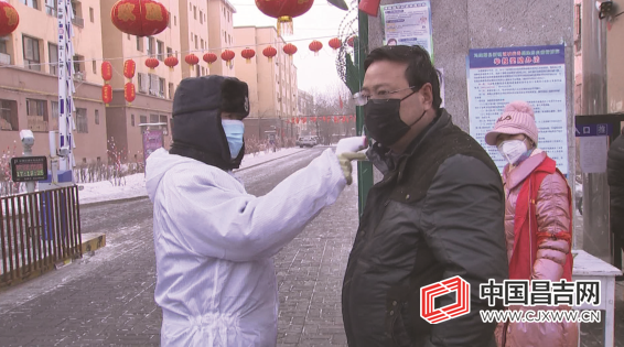 玛纳斯县多措并举做好疫情防控。图为社区干部在小区门口为居民测体温。