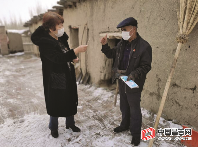 吉木萨尔县人大常委会机关驻北庭镇西上湖村“访惠聚”工作队队员给贫困老党员发放防疫口罩。崔建成 摄