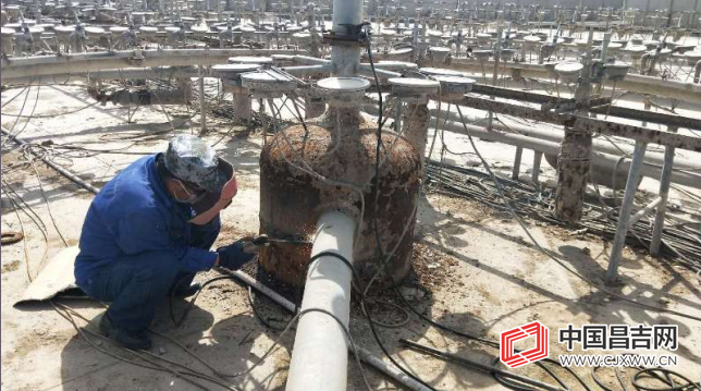 4月7日,昌吉市滨湖河景区工人董建麟正在维修景区中央公园音乐喷泉压力罐。马硕 摄