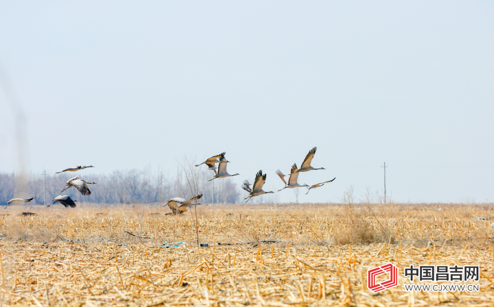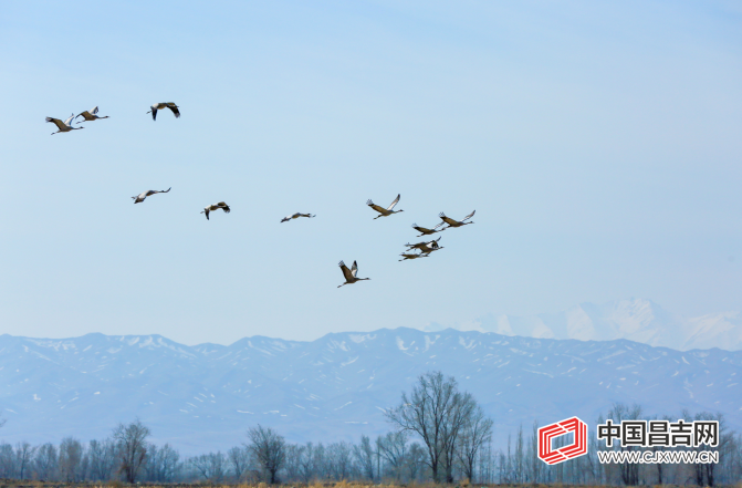近日,随着气温回升,呼图壁县石梯子乡迎来大批灰鹤觅食、嬉戏。在石梯子乡白杨河村,田间地头翩翩起舞的灰鹤与远处的雪山遥相呼应,构成一幅生态美景图。