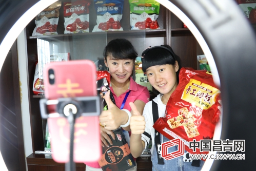 张江华和女儿为村里的土特产代言。梁宏涛 摄