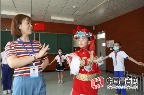 老师向孩子们传授京剧表演的站姿、手势等基本知识。梁宏涛 摄