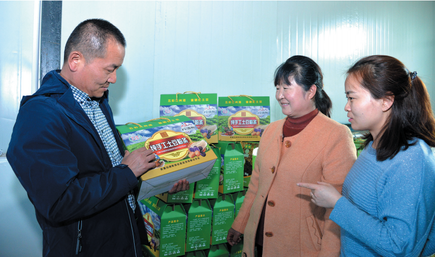 2019年3月28日,在玛纳斯县兰州湾镇王家庄村金土豆合作社,县农业农村局驻王家庄村“访惠聚”工作队队长王东军向社员们介绍新产品。