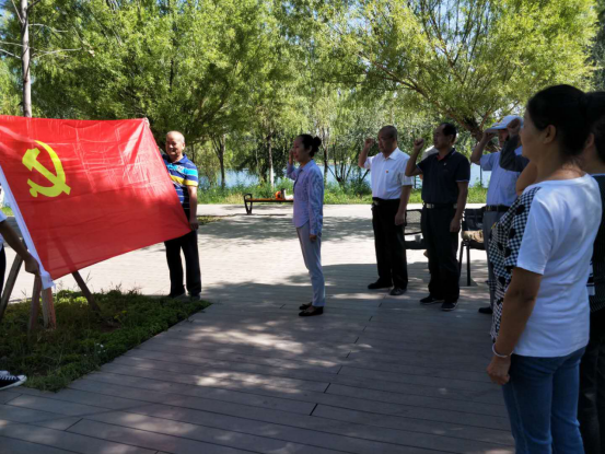李静同志带领全体党员重温了入党誓词。参加活动的老党员佩戴党员徽章,面向党旗,庄严地重温入党誓词。