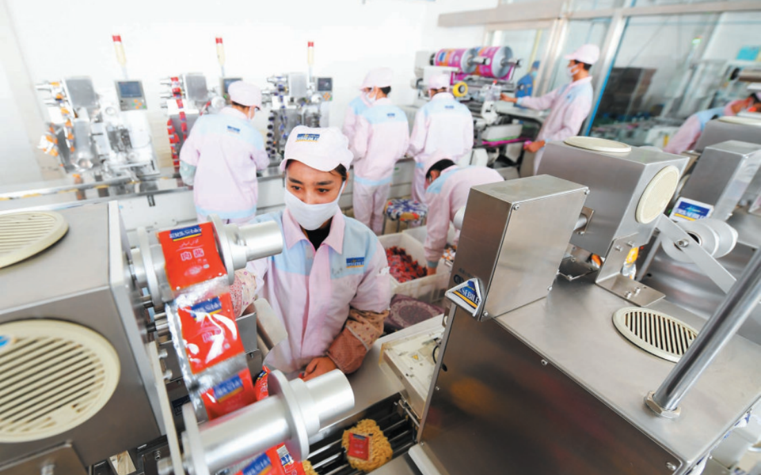 近年来,昌吉高新区彩贝乐公司积极吸纳农村困难家庭劳动力就业。图为工人在包装方便面。
