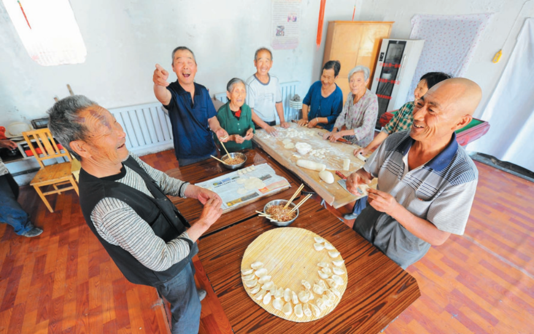 生活在玛纳斯县乐土驿镇互助院的老人们在一起包饺子,其乐融融。