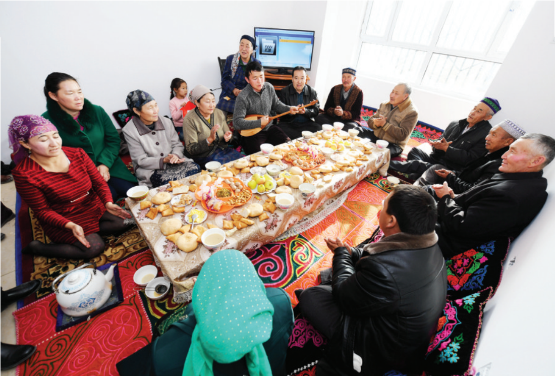 呼图壁县雀尔沟镇牧民搬进楼房后聚会欢唱。