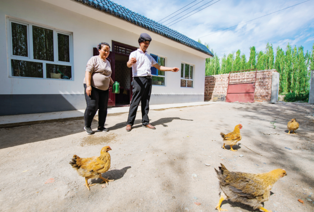 吉木萨尔县老台乡西地村村民热杰普搬进新房,还养了鸡。