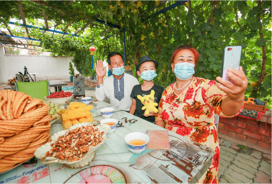 7月30日,呼图壁县二十里店镇二十里店村,艾合买提·艾外都(左一)和妻子、外孙在家中通过微信视频和居住在吉木萨尔县的女儿木呀沙·艾合买提相互问候。陶维明 摄