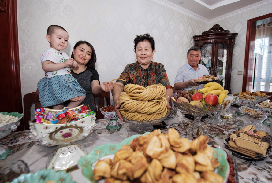 在昌吉市丽景尚城小区居民买拉木汗·阿吾提家中,馓子、油果子、油香、馕饼等小吃,哈密瓜、西瓜、葡萄等水果摆满了客厅茶几。