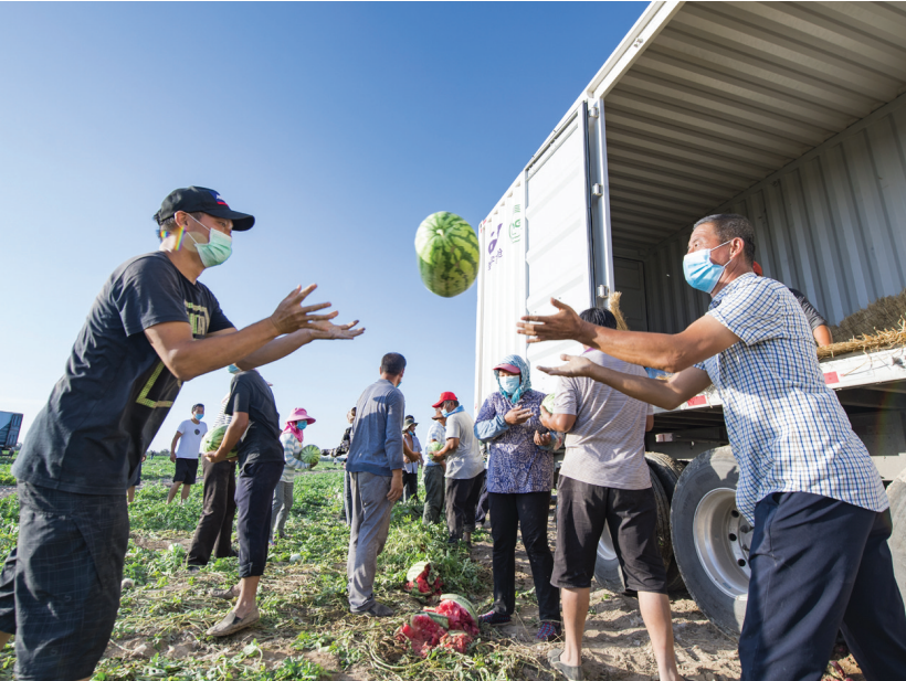 “听说要给乌鲁木齐市的各族兄弟姐妹们送去我们亲手种植的西瓜,大家伙儿都很激动,我们也为自己能够在乌鲁木齐市抗击疫情过程中贡献力量而高兴。”瓜农褚付义一边接力传送着西瓜一边对记者说。