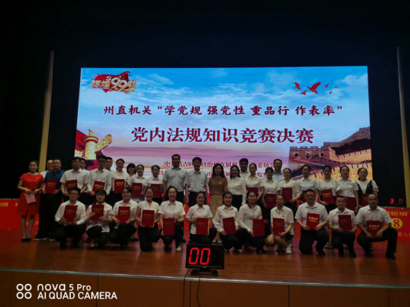 《中国共产党章程》规定党员享有的八项权利是指?参加党的有关会议,阅读党的有关文件,接受党的教育和培训……这是州直机关“学党规 强党性 重品行 作表率”党内法规知识竞赛决赛上个人风险题的一个场景,来自机关党建第二片组的3号选手一字不落的说出了党员享有的八项权利,赢得了台下观众的阵阵掌声。州直机关工委将党内法规知识竞赛活动列入到2020年党建工作要点里,5月初下发《中国共产党章程》《中国共产党廉洁自律准则》《中国共产党党和国家机关基层组织工作条例》《党委(党组)落实全面从严治党主体责任规定》《中国共产党发展党员工作细则》等30条党内法规知识题库,督促各基层党组织将党内法规学习贯彻融入到支部的日常工作中,常态化抓好党内法规知识的学习贯彻,并将党内法规知识竞赛活动作为上半年州直机关各党建片组的一项重要活动内容,以州直机关各党建片组为单位,层层开展了党内法规知识竞赛初赛,选拔出9支代表队、27名选手参加了州直机关决赛活动,比赛设置了个人必答题、小组共答、抢答题、风险题、有奖竞猜、现场互动等题型,检验了州直机关党员干部学习贯彻党内法规的成效,提高了州直广大党员干部学习党内法规、遵守党内法规意识,锻炼了广大党员干部的党性修养、增强了党性观念。截至目前,州直机关共举办党内法规知识竞赛预赛8场次、决赛1场次,受教育党员干部500余人次。