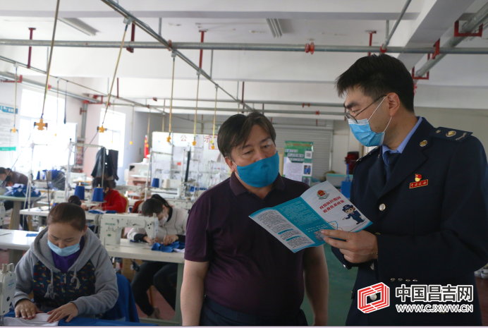 税务干部在新疆努迩乐刺绣工厂内为企业宣传税收优惠政策。 魏键 摄