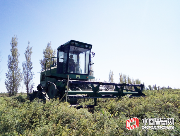 茴香地里机声轰鸣,农机手正收割着成熟的茴香。割下的茴香,一道道、一行行,有序地铺在田野上,像是铺着一条条黄绿色的腰带。收割好的茴香要晾晒四五天,再用机器脱粒、清选,装袋后由收购商运往全国各地。