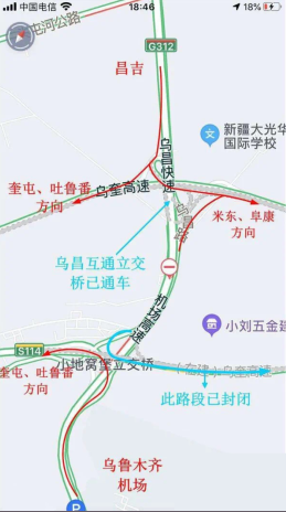 两座新建互通立交桥通车,为乌昌快速昌吉方向、机场高速乌市方向的车辆进入G30连霍高速前往吐鲁番方向或奎屯方向,以及前往G7京新高速米东区、阜康方向的过往车辆提供了交通便利。G30连霍高速、G7京新高速的来车,可通过互通立交桥前往昌吉方向,或者乌鲁木齐机场方向。