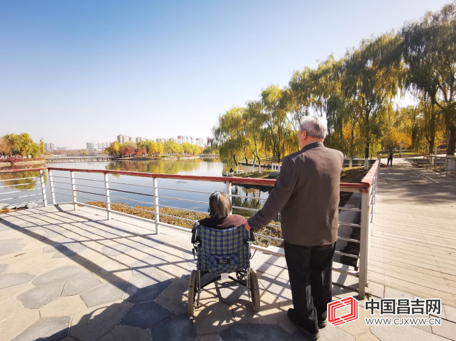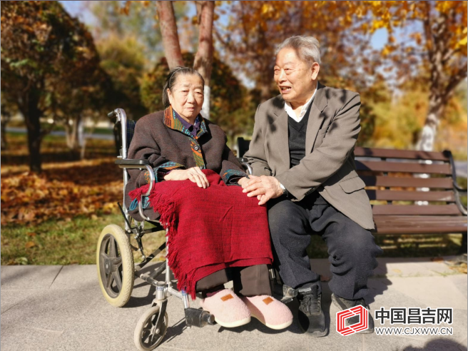“外面还是有点凉,咱把毯子盖上吧……”满头银丝的郑周寿拿过一条红色毛毯,盖在坐在轮椅上的妻子腿上。10月21日中午,郑周寿一边推着轮椅,一边和妻子徐英翠欣赏公园内的秋色,两人脸上露出幸福的笑容。