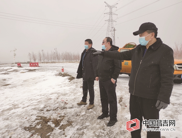 昌吉市市政养护管理中心工作人员察看三工滩积雪融化情况。 贾兴旺 摄