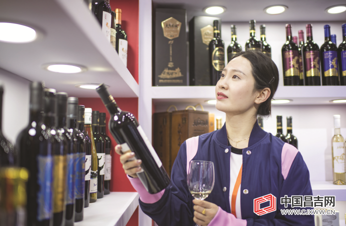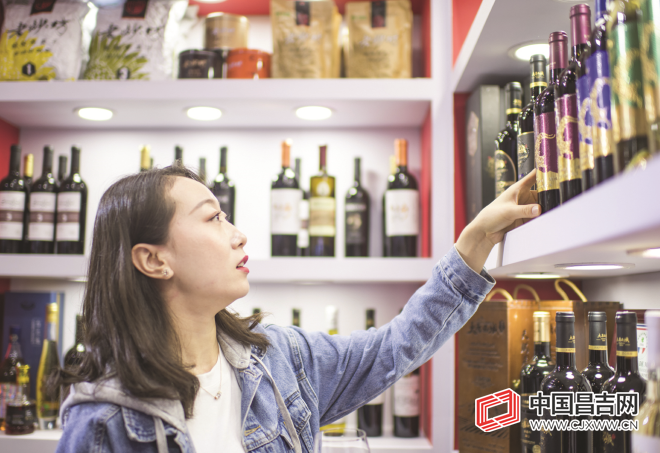 客商在天山北麓葡萄酒产区展馆挑选红酒。 记者 何龙 摄