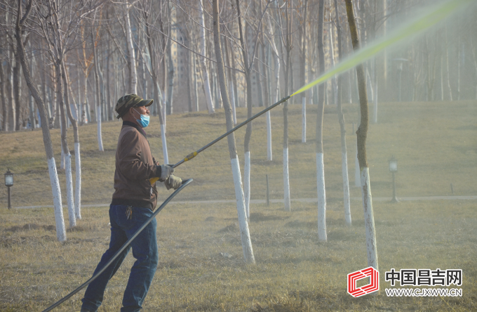 昌吉市广场景观管理服务中心组织4名防治人员,配备1辆防治车及打药机械,对滨湖河景区的中央公园、世纪园、金畅园、润畅园、鸿畅园、春畅园、中山公园及亚心广场等地,进行园林植物芽前石硫合剂喷洒防治工作。此次防治工作计划用时1周,涉及乔木4万余株、灌木2万余株、绿篱3万多平方米、草坪1400亩,使用石硫合剂约2000公斤。