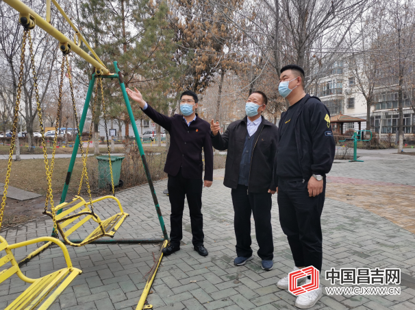 4月6日,张万选(左二)和玛纳斯县委宣传部驻南城社区“访惠聚”工作队队员检查健身器材。 赵蓓 摄
