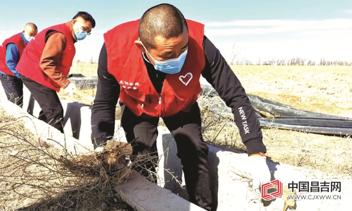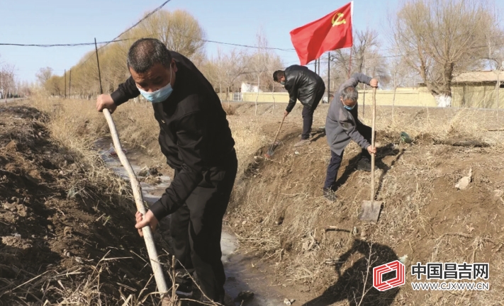 呼图壁县气象局、呼图壁县大海子湿地公园管理局驻园户村镇十三户村“访惠聚”工作队队员对渠道内及周边的生活垃圾、杂草、淤泥等进行集中清理。