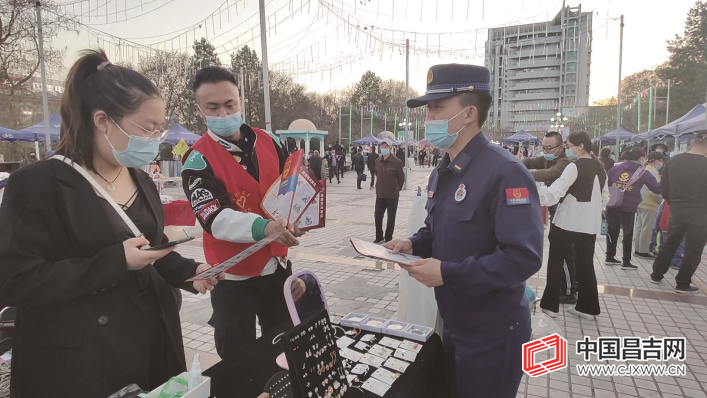 4月17日晚,昌吉市消防救援大队消防宣传员在亚心广场夜市向群众散发消防安全知识宣传资料。 何煦 摄